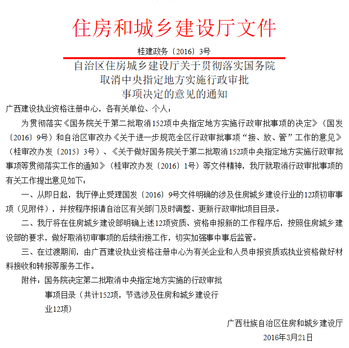 • 自治區(qū)住房城鄉(xiāng)建設(shè)廳關(guān)于貫徹落實(shí)國(guó)務(wù)院取消中央指定地方實(shí)施行政審批事項(xiàng)決定的意見(jiàn)的通知(桂建政務(wù)〔2016〕3號(hào))